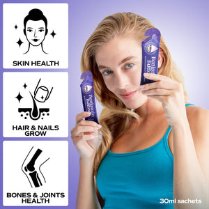 Elke 30ml sachet bevat 10.000mg hoogwaardig marien collageen en 60mg vitamine C, is vrij van noten, gluten, lactose, soja en kunstmatige toevoegingen en zoetstoffen en is Halal. Elke sachet bevat 40 calorieën voor 5g eiwit.