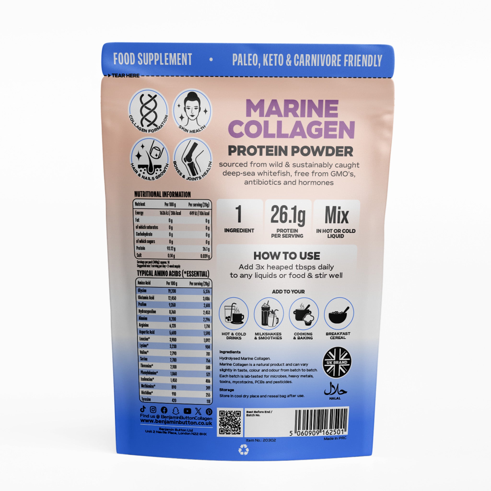- Rijk aan glycine & proline ter ondersteuning van huidelasticiteit, haargroei en gewrichtsgezondheid